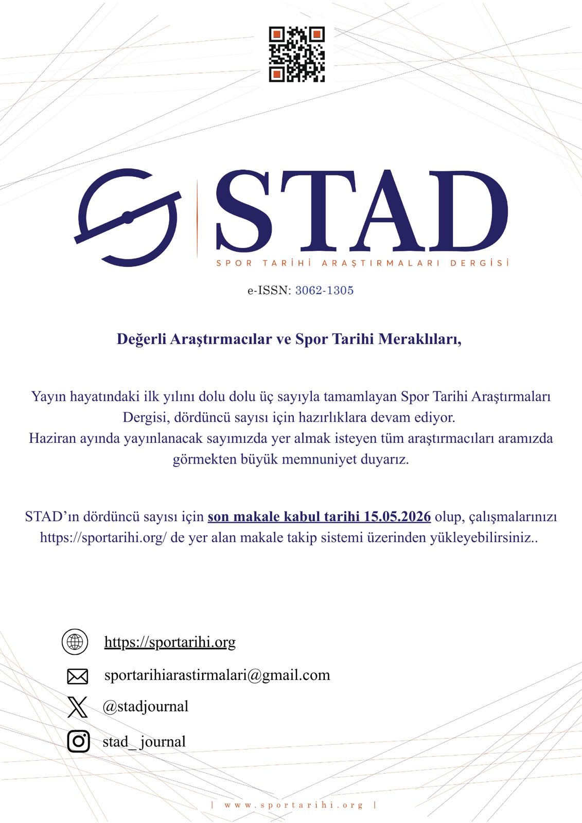 Spor Tarihi Araştırmaları Dergisi (STAD), sporun tarihsel gelişimini farklı disiplinlerin katkısıyla ele alan, hakemli bir akademik dergidir. Dergimizin Haziran ayında yayımlanacak 4. sayısı için spor tarihi alanına katkı sunan özgün akademik makale başvuruları kabul edilmektedir.